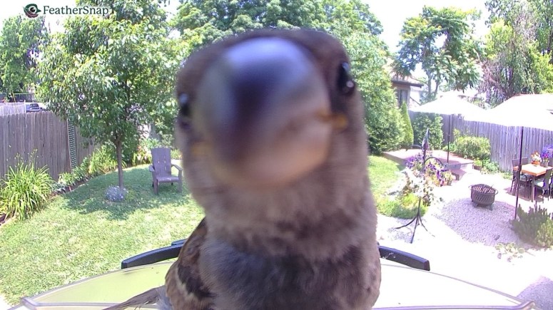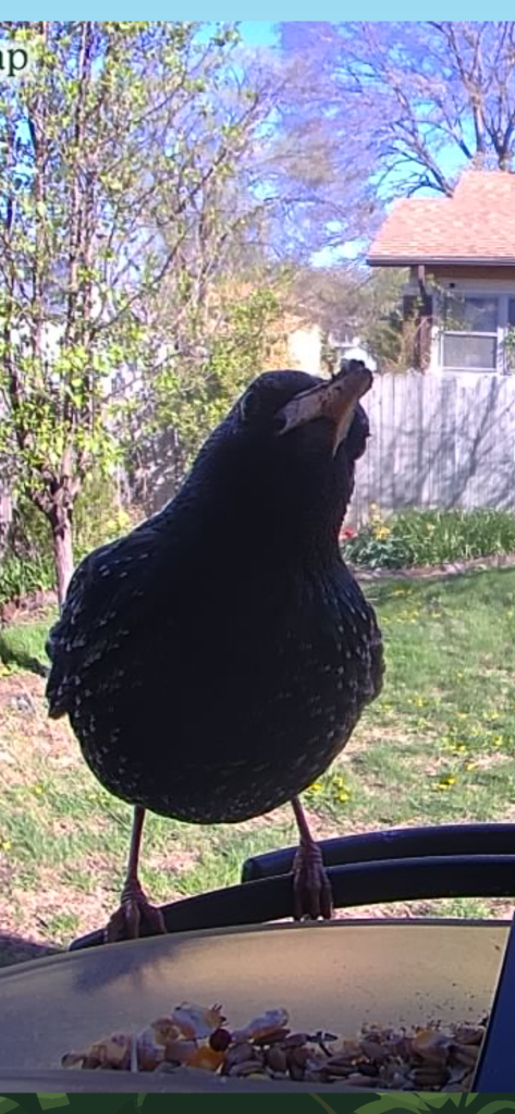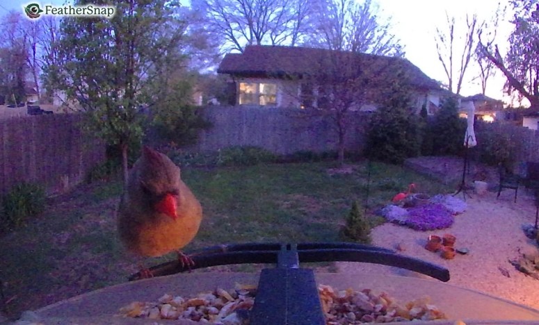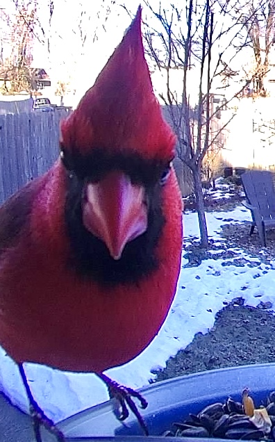 Yesterday afternoon, a young house sparrow parked herself in front of the camera in the Stace-Place photo booth and refused to leave. She just kept sitting there, setting off the sensor, smiling and cheesing and leaning in too close. The grackle offered to move her, but all the women (a wren, a cardinal, and four house sparrows) said to leave her alone. “She deserves a little time to feel good about herself,” chirped the lady starling, “We’re all feeling the stress this spring.” The lady finch added: “Yeah, with global warming and crazy orange politics and schizophrenic Illinois weather and that insane young cooper’s hawk trying to take us all out, we women could all use a little “me” time.