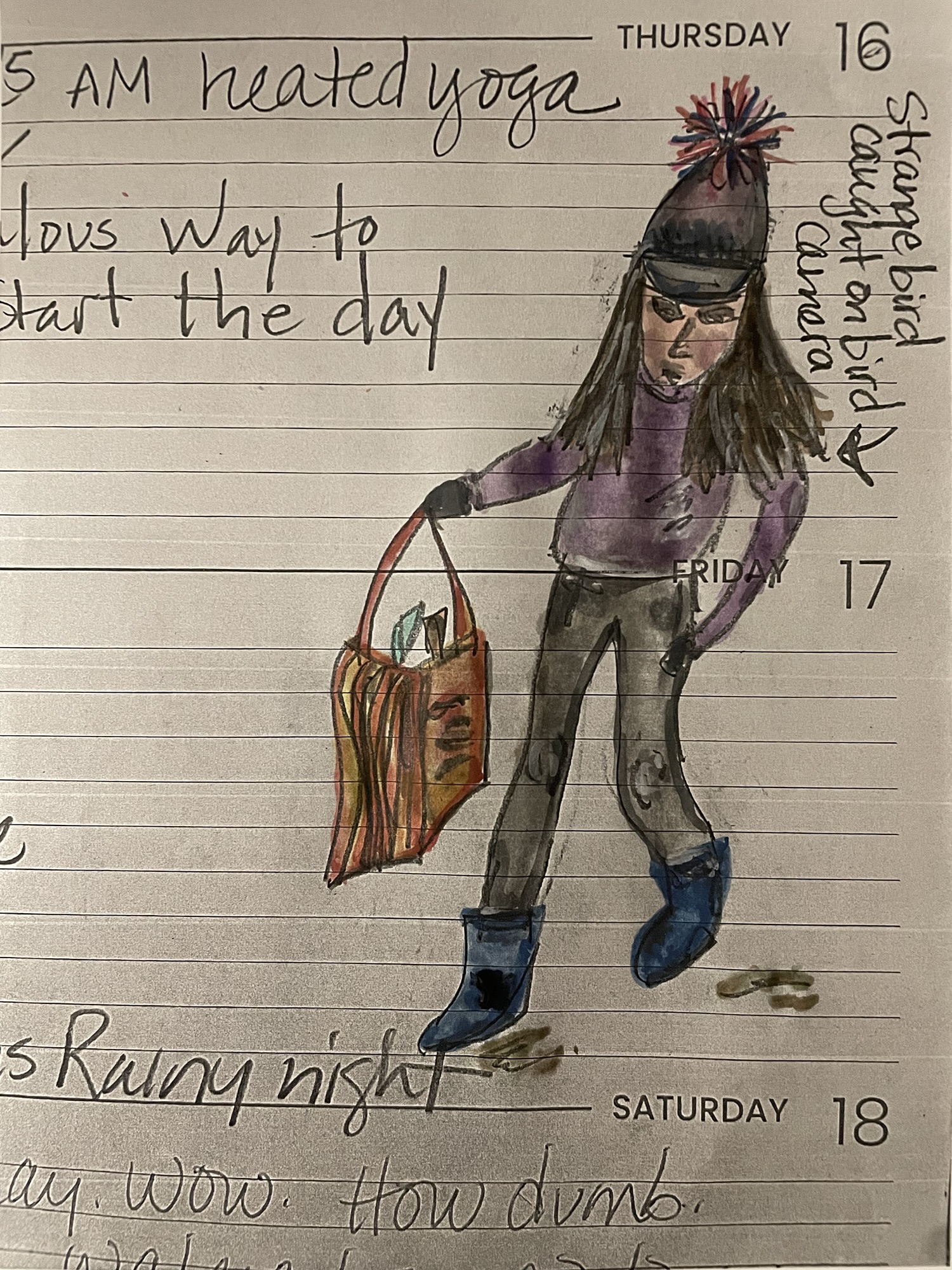 Here I come!WatercolorWatercolorIpad DrawingOdd bird taking out the recycling.Watercolor in my Engagement Calendar