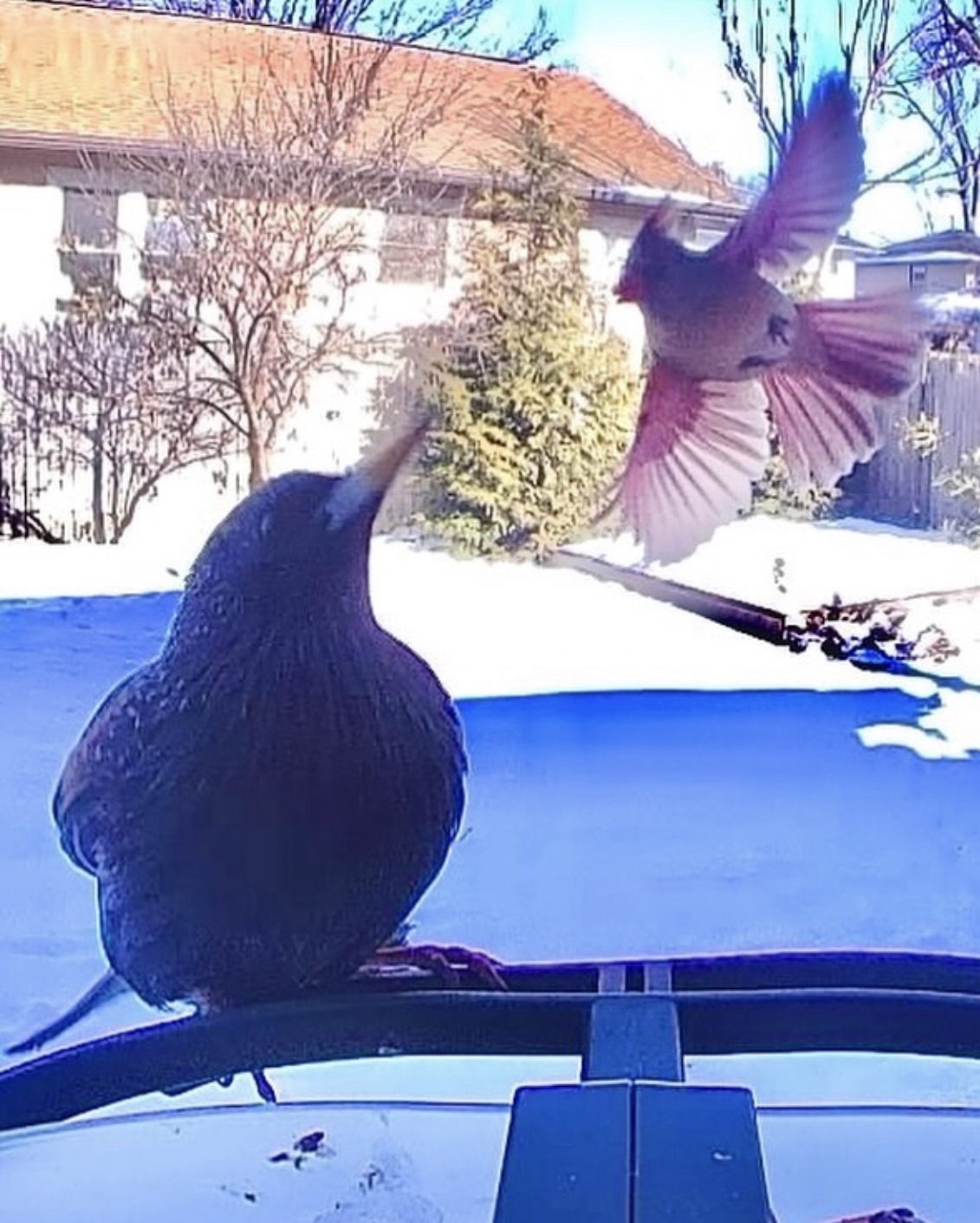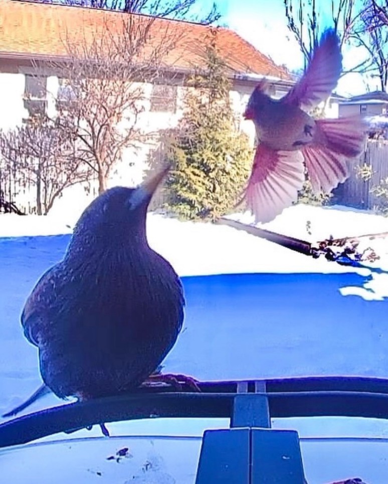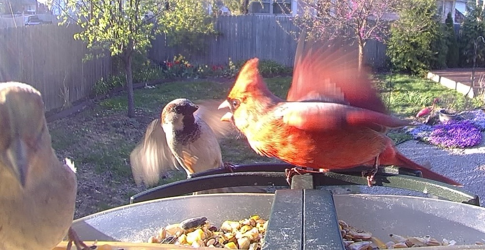Jack Sparrow, the neighborhood baseball bully picked the wrong Cardinal to trash talk this evening. He’s had run-ins before, but the dinner seeds got a little bit jammed down his throat this time. Talk about just desserts, they’ll be talking about this take-down in the backyard eastern redbud for months. No comment or defense from Jackie Sparrow, who witnessed the altercation. Just look at her, looking on, pretending not to know him—everyone in the trees knows she can’t take that husband of hers anywhere.