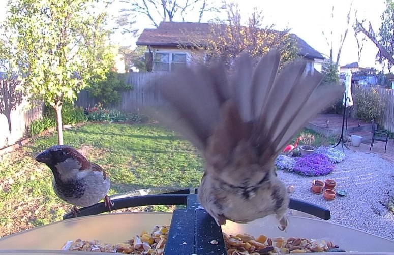 “Jesus, Phyllis, I’m trying to eat here,” screamed Mr. House this morning, as the sparrows gathered for third breakfast (or was it pre-lunch?). Witnesses told a reporter quick on the scene that Mrs. House did seem a little randy. “It is spring, you know,” said the chickadee, “We’re all feeling it right now.” The pair of mourning doves on the ground below the feeder were not interested in sparrow TMI, though, and flew off to a nearby fence to cuddle and coo in private. Once the authorities arrived, Mr. and Mrs. House were peacefully eating with the other sparrows, and no one was willing to take time from the meal to offer any more details of the kerfuffle.