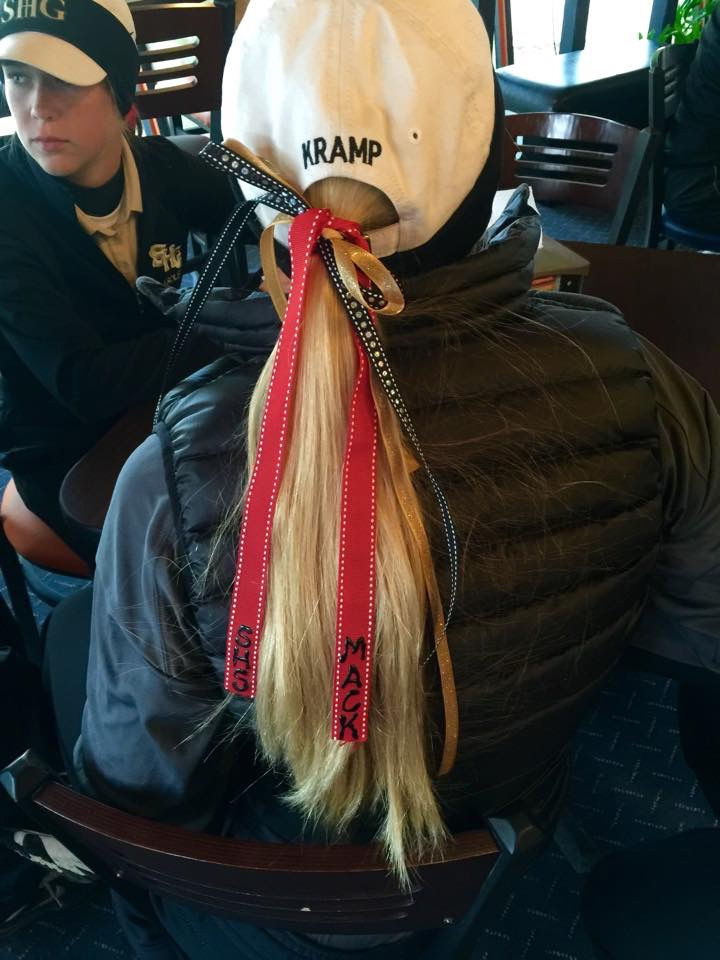 Sometimes, it is a simple gesture that warms our hearts and keeps Mack close. In November, just weeks after Mack’s death, some of her golfing buddies (who played for a rival high school) wore Mack ribbons in Mack’s high school colors during their appearance in the state tournament. A favorite Mack mom made memorial t-shirts, and a younger softball teammate wrote her nickname for Mack on the catcher’s mitt that Mack had bequeathed to her. A lifelong friend and golf teammate adorned her golf bag with ribbons honoring Mack, and I and at least two other people who loved Mack, got tattoos to commemorate the imprint Mack made upon our hearts. (https://macksmommabear.com/2015/04/22/permanent-mack/).
